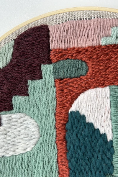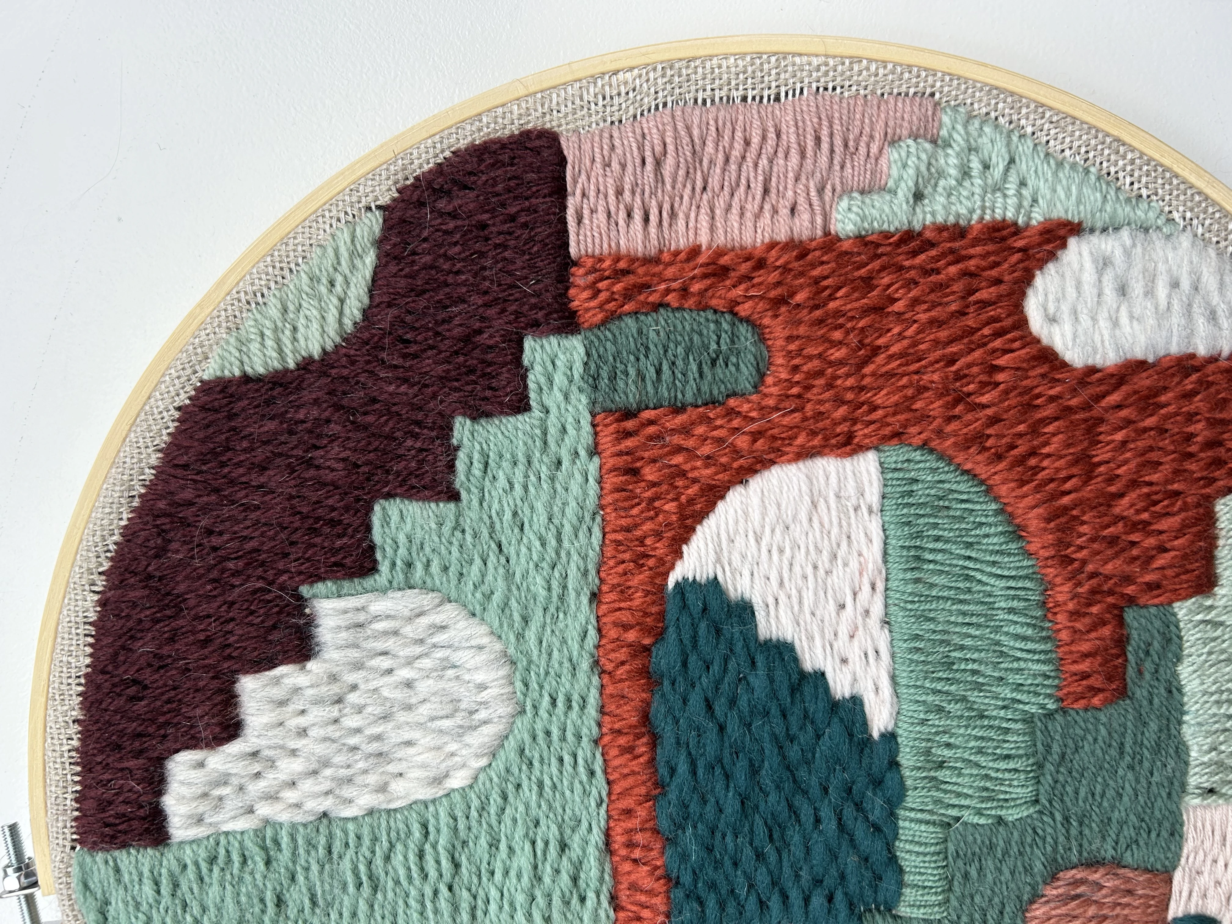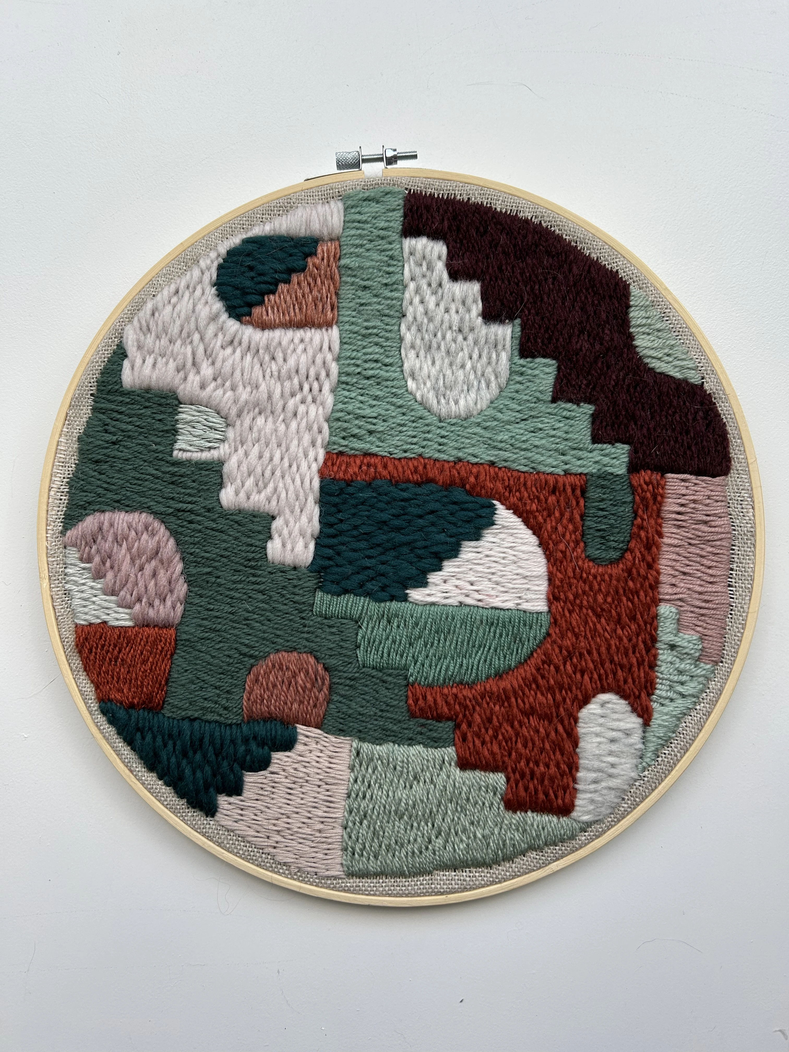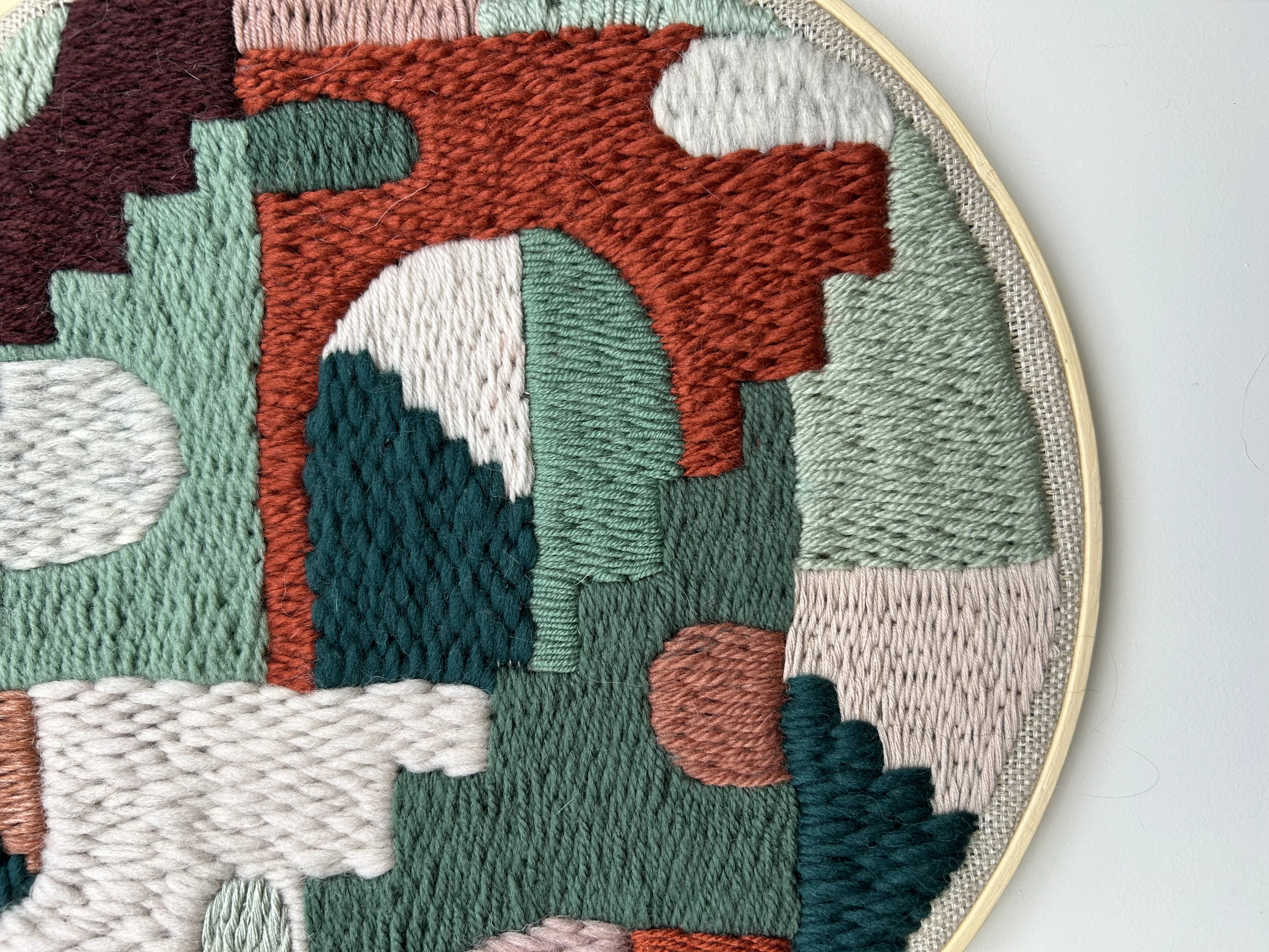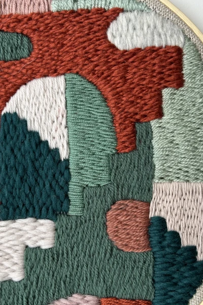 Artwork with stairs and doors embroidered with green, red and pink tones. In a 30cm hoop.