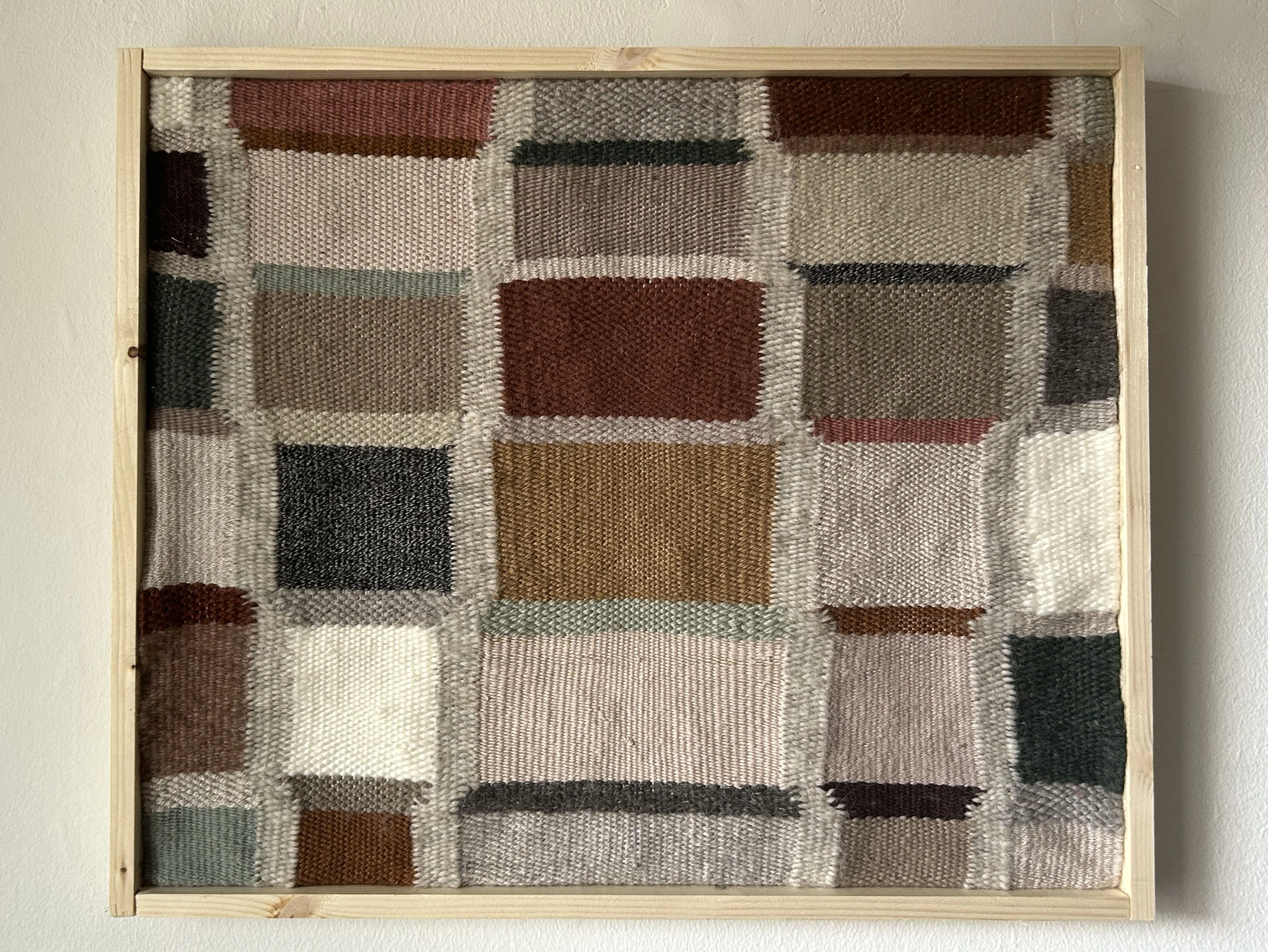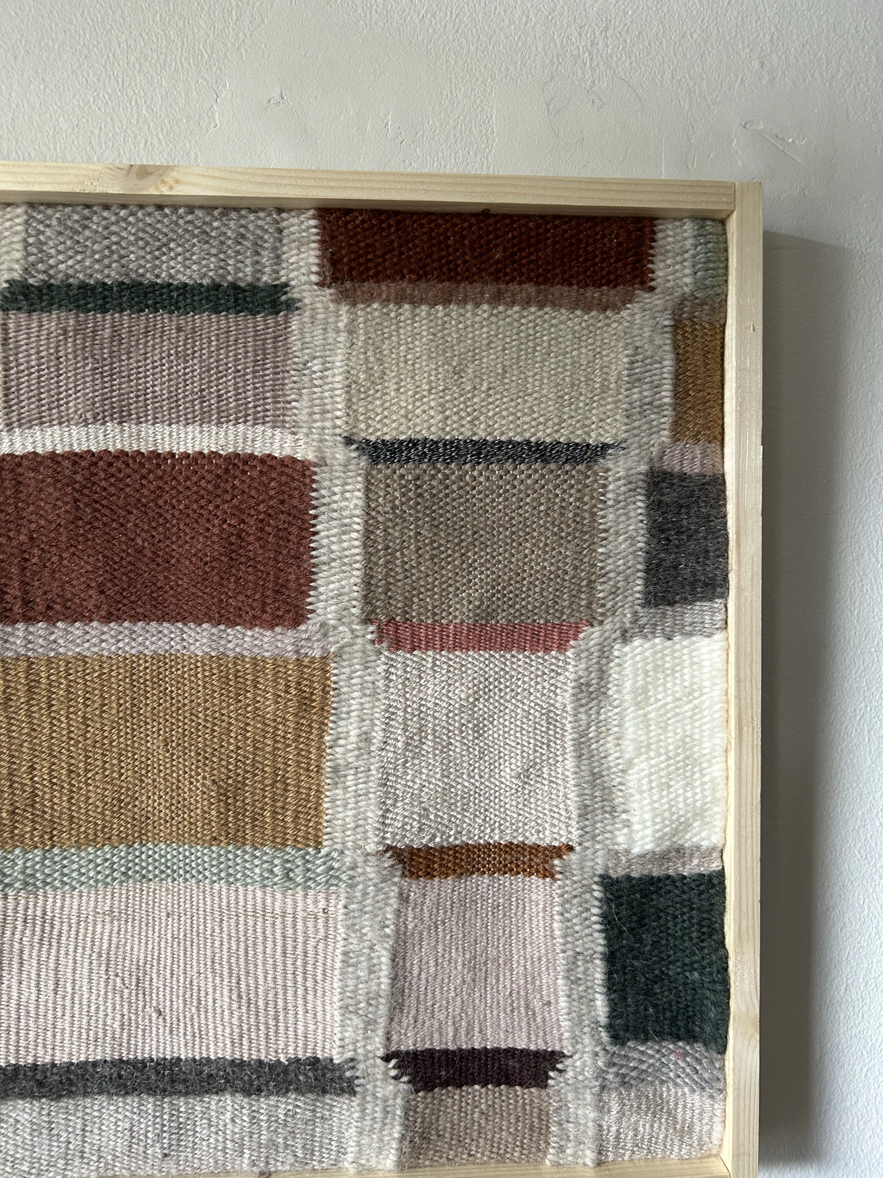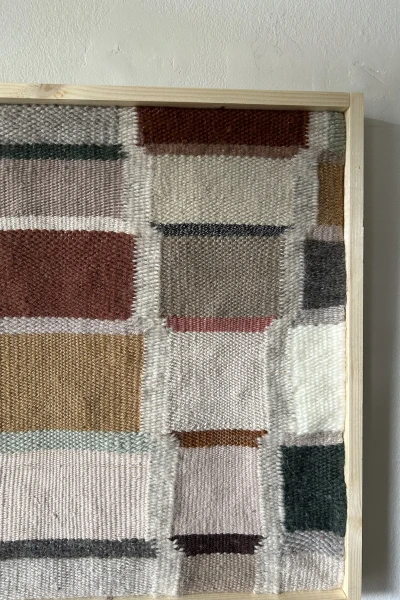 Woven artwork. Earth tones, red and grey. 51x51 cm with wooden frame included.